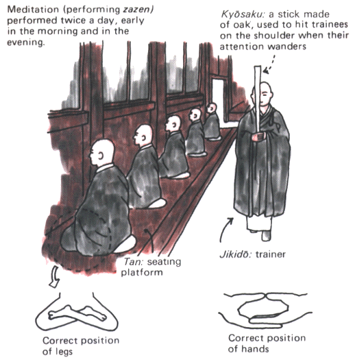 Seated zazen (座禅) meditation is practiced every class in order to achieve a calm sense of preparedness, and to heighten overall awareness.